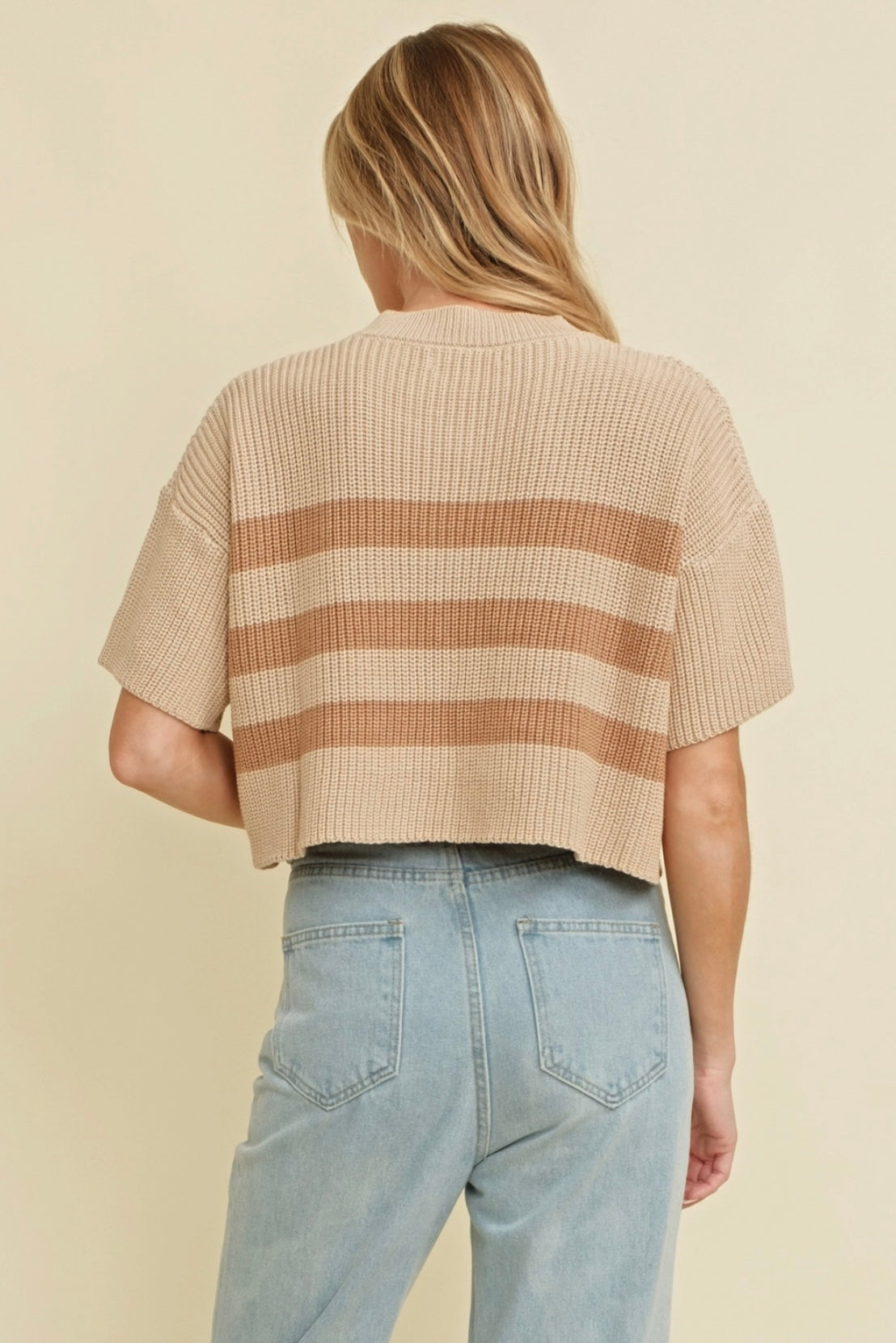 Cozy meets chic with this lightweight knit sweater. Featuring wide camel and beige stripes, a relaxed drop-shoulder fit, and a flattering cropped cut, it’s the perfect transitional piece to carry you from summer into fall. Pair it with high-waisted jeans, skirts, or layered over a dress for effortless style.
